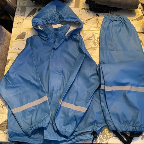 Sættet har primært været brugt som ekstra sæt til når regntøjet var glemt i skolen, og er derfor stort set som nyt. Det er af mærket Poco Piano.