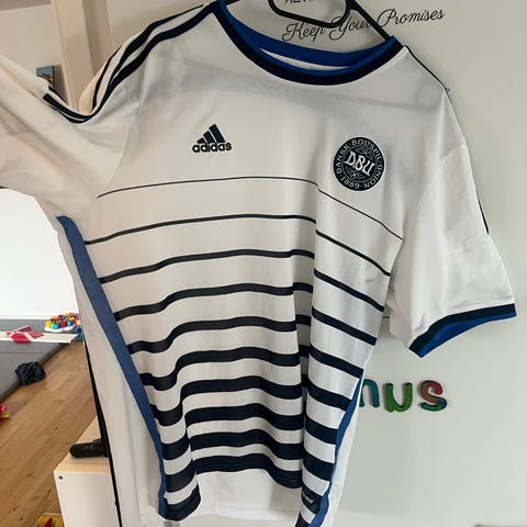 Adidas fodboldtrøje i hvid og rød med klublogo på brystet og trykt nummer 18 på ryggen. Kortærmet model med rund hals og kontraststriber på skuldrene. Velegnet som fodboldtrøje til træning eller kamp. Materialeoplysninger og størrelse fremgår af den indvendige mærkat.
