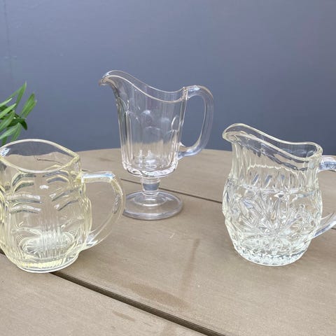 Tre snart antikke flødekander i presset glas - så vidt jeg ved, er de blæst i form. Måske fra Fyns Glasværk fra 1930. De to næsten ens har lidt hvidt i glasset. Ganske små nags i bundkant.