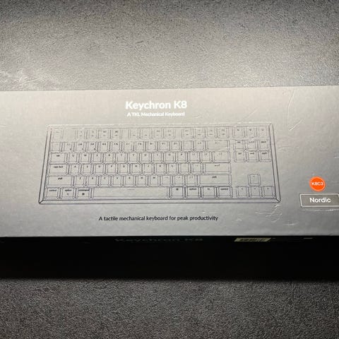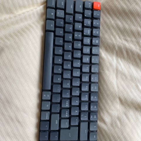Mekanisk keyboard med hvidt lys og røde Keychron switches. Fungere med PC og Mac, samt via Bluetooth og usb-c.