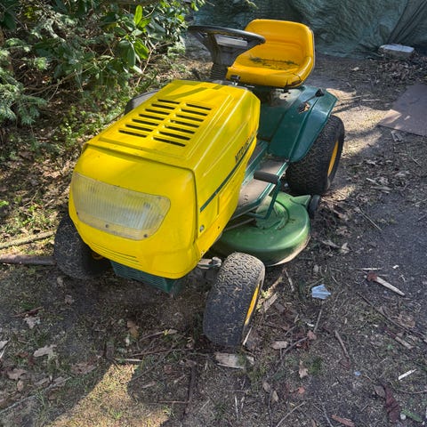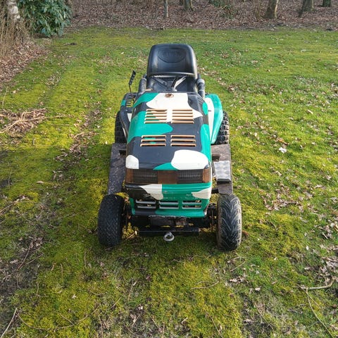 Texas havetraktor i grøn farve. Modellen er en mindre havetraktor/ride-on plæneklipper med ratstyring og sæde. Motor og chassis ses adskilt på billederne. Maskinen har fire hjul med plænedæk og er beregnet til kørsel på græsarealer. Velegnet som havetraktor til plæneklipning eller som basis for reparation eller reservedele, afhængigt af stand og funktion, som ikke fremgår af billederne alene.