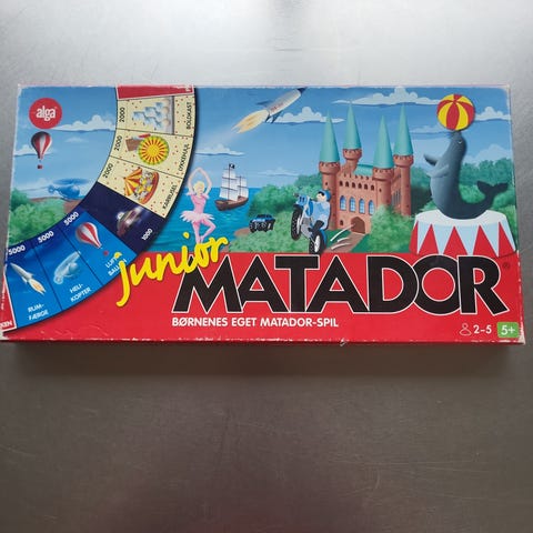 Alga Junior Matador brætspil til børn. Spillet er en forenklet udgave af Matador, tilpasset yngre spillere. Spillepladen er rund med felter i forskellige farver og motiver. Sættet indeholder spilleplade, kort med spørgsmål og begivenheder, pengesedler, spillebrikker i flere farver, terninger samt dansk spillevejledning. Velegnet til 2-5 spillere fra ca. 5 år og opefter.