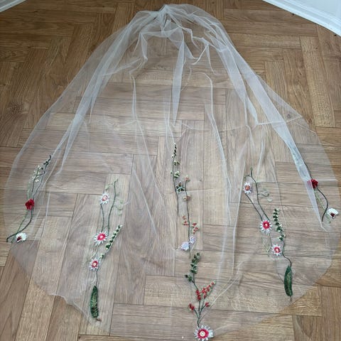 Virkeligt smukt brudeslør med god solid hårkam, så sløret sidder godt og solidt. Helt nyt og aldrig brugt. Kostede 2500 kr i brudebutikken. Eftersom jeg ikke fik det brugt sælger jeg det billigt videre så en anden kan få glæde af det.