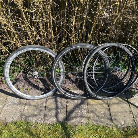 Sæt cykelhjul bestående af forhjul og baghjul med smalle fælge og dæk til citybike eller hverdagscykel. Forhjulet er udstyret med navdynamo og tilhørende forlygte med kabeltilslutning. Baghjulet har standard nav til kædetræk. Hjulene har klassiske eger og metalfælge. Velegnet som reservedele eller udskiftning på kompatible cykler med tilsvarende hjulstørrelse.