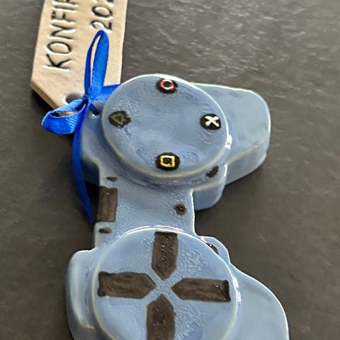 Håndlavet keramisk figur formet som en spilcontroller i blå med malede knapper og detaljer. Figuren er glaseret og har en flad bagside, så den kan ligge på et bord eller en hylde som dekoration. Velegnet som pyntegenstand til fx gamer-værelse eller kontor. Perfekt konfirmations eller fødselsdags gaver til gameren…De laves også med skilte (Hvis man bestiller i god tid). Se alle de forskellige slags på Min shop Kreadullerne.dk…Hvor de også kan bestilles…