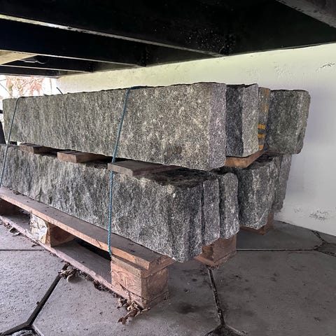 Granit kantsten i grålige nuancer med let rustik, kløvet overflade. Stenene er rektangulære og egner sig til brug som kantafgrænsning ved indkørsler, terrasser, bede eller stier. Velegnet til udendørs belægning og haveanlæg, hvor der ønskes en naturlig granitkant.
