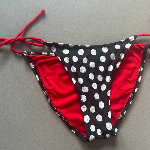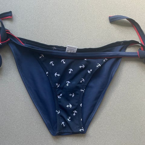 H&M bikiniunderdel i størrelse M. Underdelen er hvid med mørke striber og bindebånd i siderne, så pasformen kan justeres. Materialet er polyamid med indvendig foring. Velegnet som underdel til bikinisæt til kvinder.