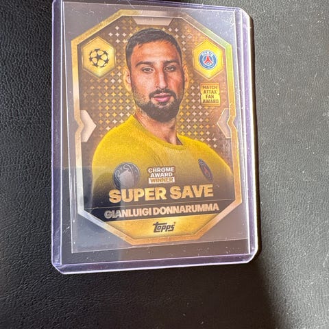 Topps Finest fodboldkort med auto fra Gianluigi Donnarumma fra Italien. Kortet er en grøn parallel, individuelt nummereret 24/99 på forsiden.
