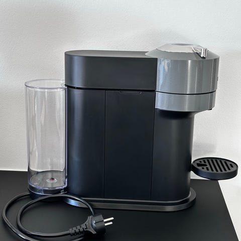 Maskinen er beregnet til kaffekapsler og har et kompakt, rektangulært design med aftagelig vandtank på siden og drypbakke foran. Fronten har udløb til kaffe samt betjeningsknapper øverst. Velegnet til brygning af enkeltkopper kaffe ved brug af kompatible kapsler.