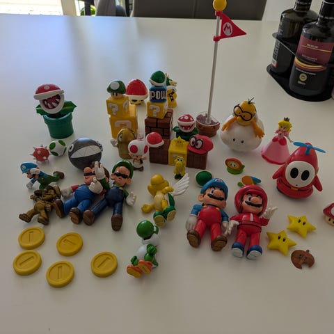 De to store er dispensere, mens de fire små er figurer, der har siddet oven på rør med M&M’s.