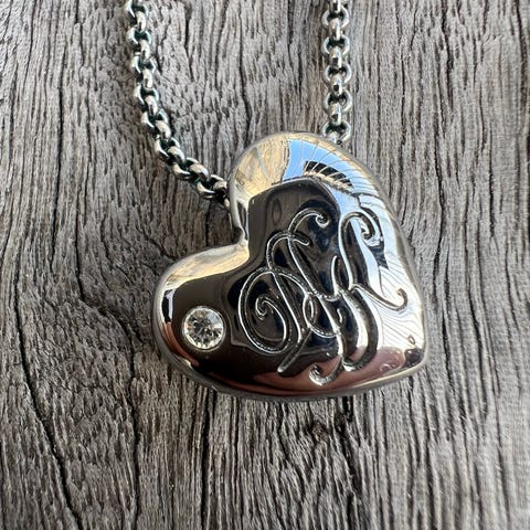 Dyrberg/Kern halskæde til kvinde i stål med krystal. Halskæden har et vedhæng formet som et hjerte med indgraveret motiv og lille klar krystalsten. Kæden er i mørktonet stål med karabinlås og lille rundt Dyrberg/Kern-mærke ved låsen. Smykket er velegnet som hverdags- eller anledningssmykke.