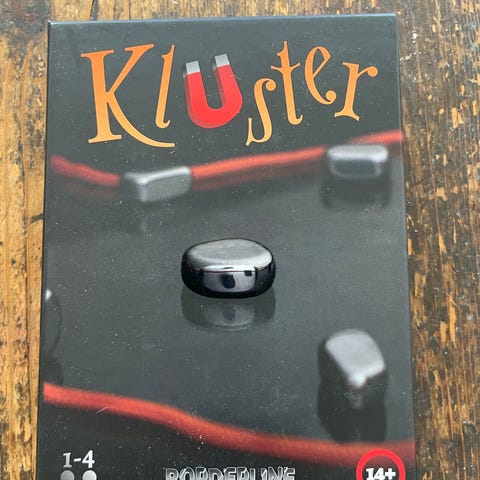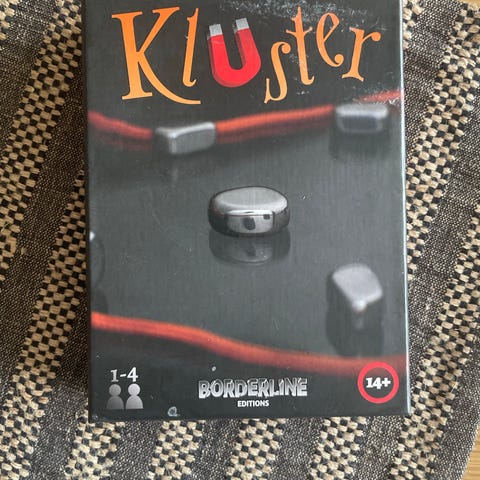 Borderline Kluster brætspil. Spillet er for 1-4 spillere og anbefales fra 14 år. Indholdet omfatter magnetiske brikker, snor til spilleområdet samt pose og regler. Spillet går ud på at placere de magnetiske brikker inden for snoren uden at de tiltrækker hinanden og klumper sig sammen. Velegnet som kortvarigt strategisk og taktisk spil for unge og voksne.
