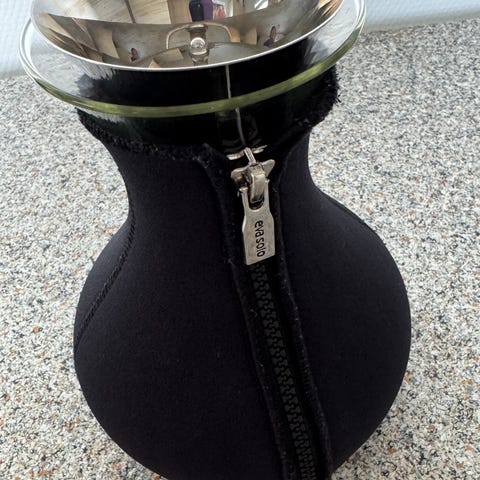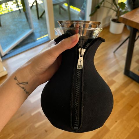 Tebrygger, Eva Solo, 1 liter glaskande med tefilter og stempel. Uden på strikket dragt, som er medvirkende til at teen holder sig varm. Dragten tåler vask ved skåne program og kanden kan komme i opvakemaskinen.