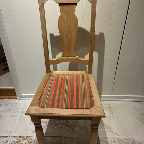 10 stk. træstole med polstret sæde i mønstret stof. Stolene har høj ryg med tre tværgående rygstykker og lige ben med tværstivere. Sædet er betrukket med flerfarvet møbelstof med klassisk mønster. Velegnet som spisebords stole. Der er lidt slid på sædet på et par stykker af dem, men ellers er de i god stand.