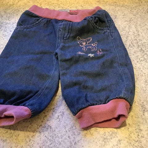 2 par fine bukser fra Name it str. 62. Et par demin i stræk og et par leggings med blonde skørt. Begge par er brugt meget lidt.
