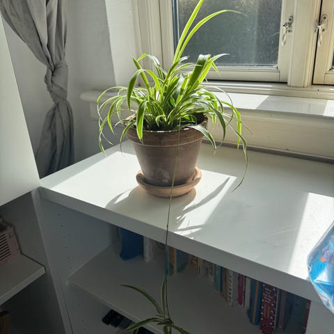 Chlorophytum comosum, en robust og tilgivende plante, som trives i mange forskellige rum og lysforhold. Den kan være med til at opretholde luftfugtighed og fungerer som en naturlig skærm mod støv og små partikler i luften.