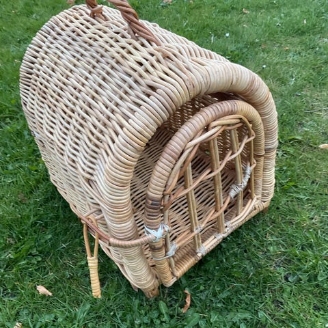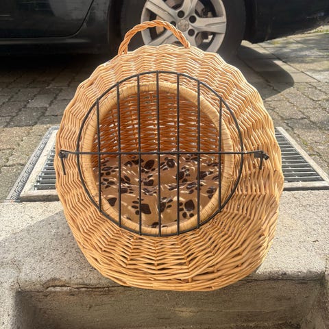 Flettet transportkurv til kat eller lille hund i naturfarvet flet. Kurven har rund form med bærehank øverst og metalgitter foran, der kan åbnes og lukkes. Egnet til transport eller som hvileplads for mindre kæledyr. Materialet er flettet naturflet, som giver god ventilation gennem siderne.
