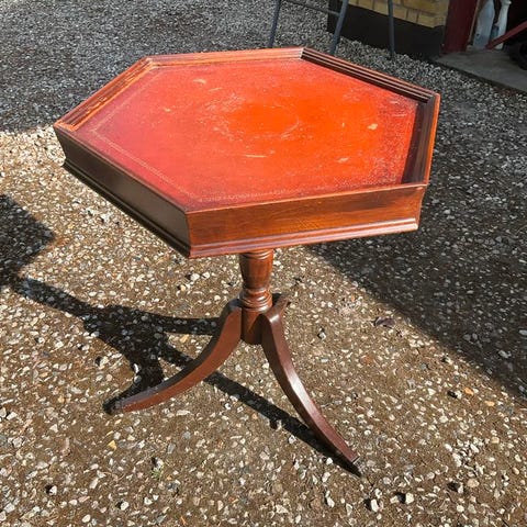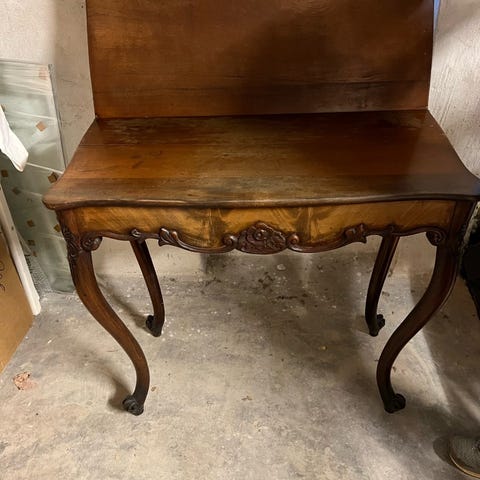 Der er faldet små stykker af mahogni-finer, på bordkant og på det ene ben. Det kan ses på de 3 sidste fotos. Bordet trænger til oliebehandling, hvilket er ikke forsøgt endnu.