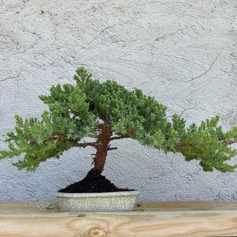 Klassisk udendørs bonsai-materiale af Juniperus chinensis “Kishu”, i en håndlavet og håndtegnet potte. En vellidt kinesisk juniper-variant, beundret for sin tætte, fine eviggrønne løv og fremragende egnethed til bonsai-formgivning og forfinelse. Dette træ tilbydes i øjeblikket i en håndtegnet keramisk potte, der supplerer dets naturlige karakter.