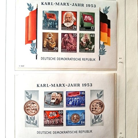 Komplet postfrisk samling med alle gode udgaver og blocs, herunder også Debra-Block, kineserne, alle 4 Marx-Blocks osv. Derudover extras som sammenslørtryk.