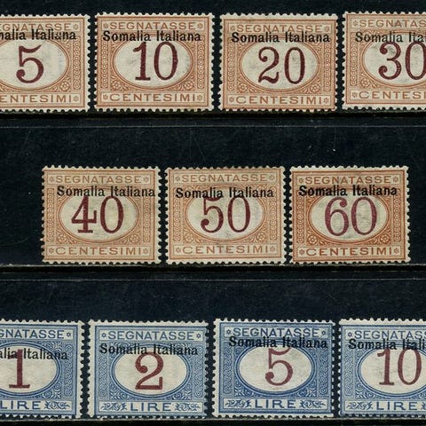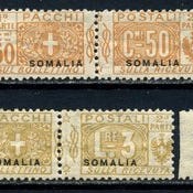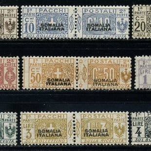 Fra Italiensk Somalia, Pacchi postali, komplet serie med 15 værdier med rød overskriftspræg; ny uden gum, certifikat og eksperts underskrift; Sassone N. P 30/42. Klik på den blå "gå til varen" knap, for at købe eller byde på denne vare. Den samlede pris vil blive vist inden du afgiver dit bud.