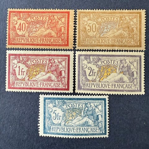 Fra Frankrig, 1900, komplet Merson-udgivelse - MNH, katalog Yvert 119/123. Klik på den blå "gå til varen" knap, for at købe eller byde på denne vare. Den samlede pris vil blive vist inden du afgiver dit bud.