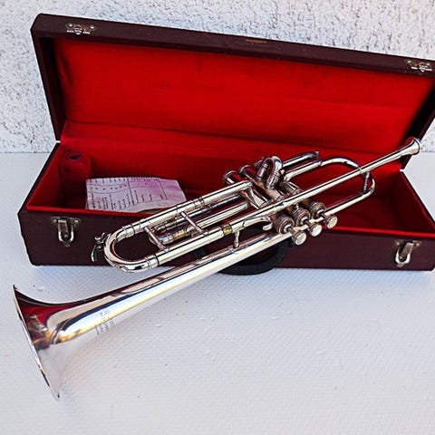 Trumpet i Es-dur er i meget god stand. Instrumentet er stemt og teknisk velfungerende. Klar til brug, nogle få små buler. Det er ikke blevet repareret. Med mundstykke, etui, et hårdt etui fra Yamaha og et banner fra det tyske brandvæsen. Afsendt med kurir.