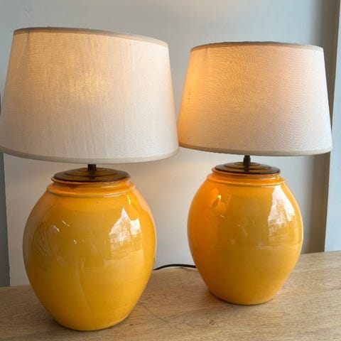 Franskfremstillet Robert de Schuytener Art Deco-lampe i keramik, bronze og guldfarvet metal med mørkegrøn stamme og 52 cm bred lampskærm, model Sapporo, dimensioner 80 x 52 x 52 cm, i god stand med mindre tegn på ælde og i funktionsdygtig stand. Klik på den blå "gå til varen" knap, for at købe eller byde på denne vare. Den samlede pris vil blive vist inden du afgiver dit bud.