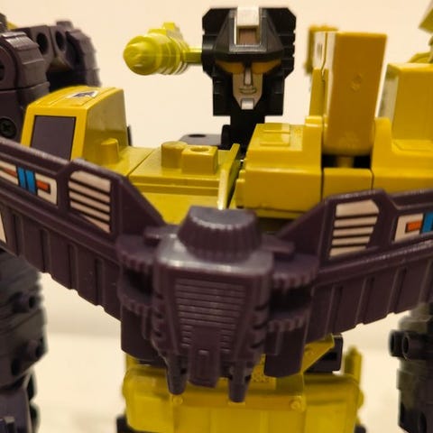 Transformers Sixshot & Soundwave. Direkte fra begyndelsen af 80’erne, to af de mest ikoniske Decepticons i G1-serien. Sixshot, robot-ninjaen, i stand til at forvandle sig til 6 forskellige former: Robot, Bil, Tank, Ulv, Jet, Lasergevær. I perfekt stand. Fuldt udstyret med våben og klistermærker. Soundwave (denne første version hed Cassette Man), roboten i stand til at forvandle sig til kassetteafspiller, med inkluderet en mini kassette-robot, der kan forvandle sig til en grib. Den sidstnævnte er lidt beskadiget. Tiden har slidgivet brud på gribbens