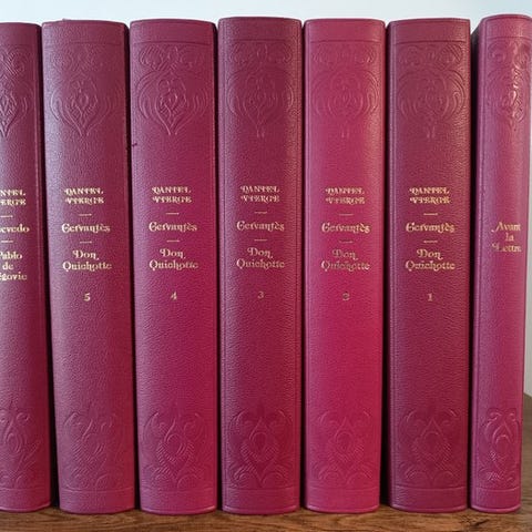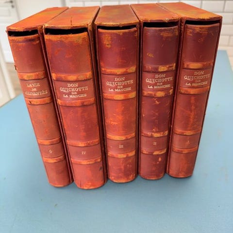 Pragtfuld og sjældent forlagskartonbind til denne originale udgave af den franske oversættelse etableret af Louis Viardot og første tryk af Tony Johannots illustrationer, som består af to frontispicer trykt på Kina, to titel-udgaver gravering samt 800 store vignetter in-tekst.