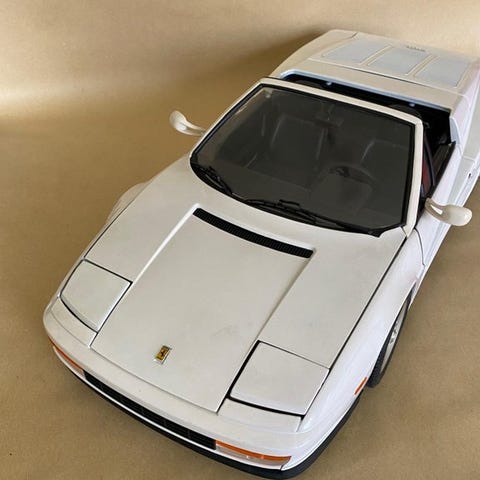 Ferrari F 40 Pocher 1:8 model i plastik og hvidmetal, rød, næsten nyskick, over 50 cm lang og 25 cm bred, emballage uden originalemballage. Klik på den blå "gå til varen" knap, for at købe eller byde på denne vare. Den samlede pris vil blive vist inden du afgiver dit bud.