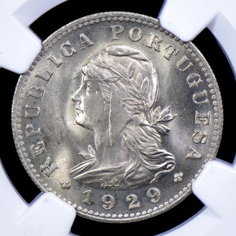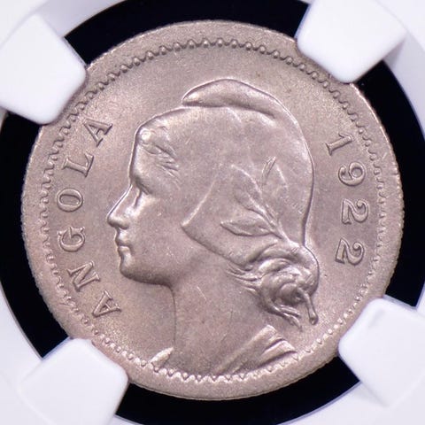 1948 sølvmønt på 50 centavos fra São Tomé og Príncipe, vurderet MS65 af NGC, certifikationsnummer 8234351006, Escassa. Klik på den blå "gå til varen" knap, for at købe eller byde på denne vare. Den samlede pris vil blive vist inden du afgiver dit bud.