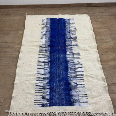 Håndlavet Tunesisk berber kilim- tæppe i uld på bomuld, 130 cm x 75 cm, ca. 3 kg, i veldig god stand og professionelt rengjort, med Kilim berbère mærket og Kelim Design tapis berbère 100% håndlavet. Klik på den blå "gå til varen" knap, for at købe eller byde på denne vare. Den samlede pris vil blive vist inden du afgiver dit bud.