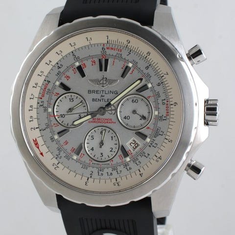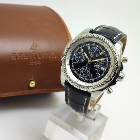 Breitling Barnato Racing Chronograph M41390, 48 mm stålcase med mønstret bezel, sort urskive, automatiske bevægelse, gummirem, år 2006 (2000–2010), herre, i god stand med synlige brugsspor, uden æske eller papirer. Klik på den blå "gå til varen" knap, for at købe eller byde på denne vare. Den samlede pris vil blive vist inden du afgiver dit bud.
