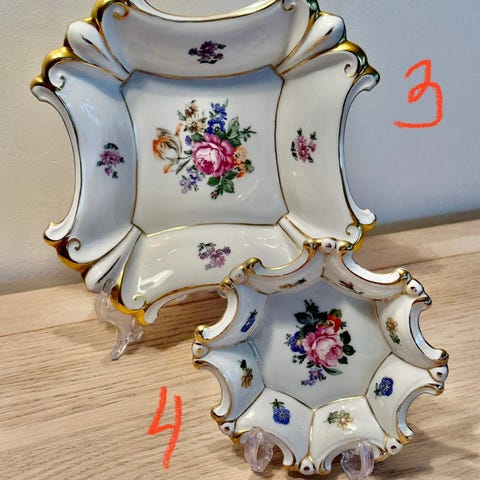 til salg står et pragtfuldt sæt af fint porcelæn fra den anerkendte Thüringer manufaktur Graf von Henneberg Ilmenau. Ensemblet imponerer med sin omhyggelige, buede formgivning med rocaille-relieffer, en rig guldramme samt detaljerede, farverige blomsterbuketter i stil med klassisk Meissens blomstermaleri.
