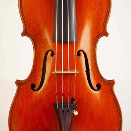 Særdeles smukt udvalgt træ og et stykke arbejde udført af en erfaren håndværker. To stykker ryg i imponerende flammesh træ, top i gran med høj åretegning, gylden ravfarvet lak. Den samlede længde på violinen er 660 mm; kroppen 395 mm. Bredden af den øverste del: 188 mm; midten: 128 mm; nederste: 230 mm.