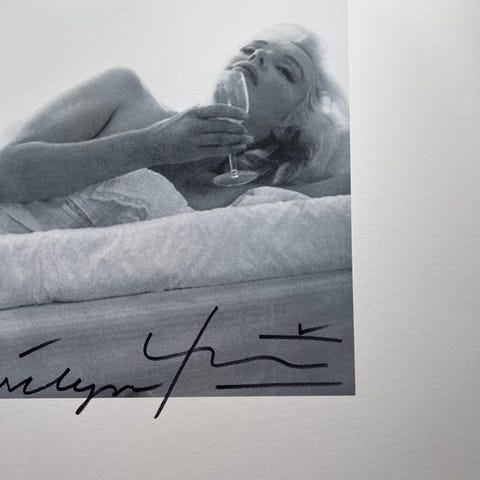 " Famous Marilyn Monroe nude under the Chenille Scarf" er signeret i rød blyant på forsiden og copyright stemplet og underskrevet på bagsiden af kunstneren. Udgaven er nummereret 37/72.