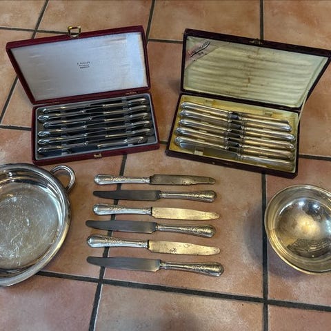 • Knive med rustfrit stål blad og sølvbelagte håndtag