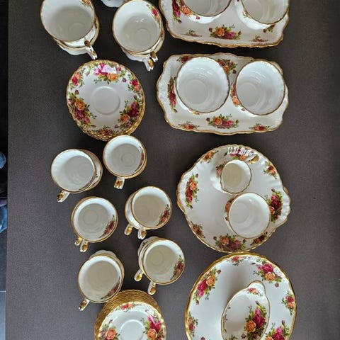 til salg står et kvalitets kaffesæt fra den traditionsrige engelske fabrik Royal Albert i det populære dekor ‘Old Country Roses’. Sættet udmærker sig ved sit klassiske blomsterdekoration med rosenmotiver og fine gyldne kanter og betragtes som en tidløs klassiker inden for britisk porcelainekunst.