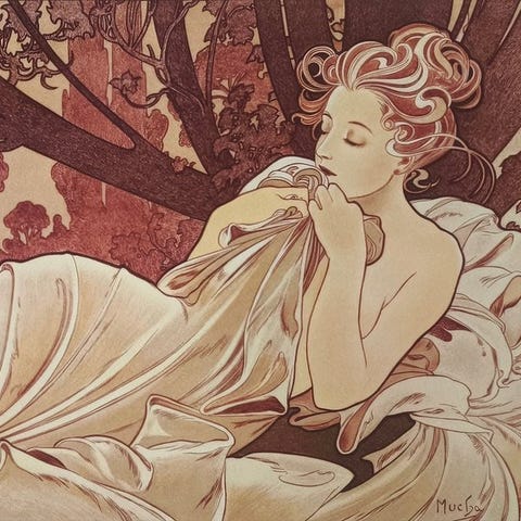 Dette kunstværk er et billede af "Winter" fra serien “De Jaargetijden” af den berømte Art Nouveau-kunstner Alphonse Mucha.
