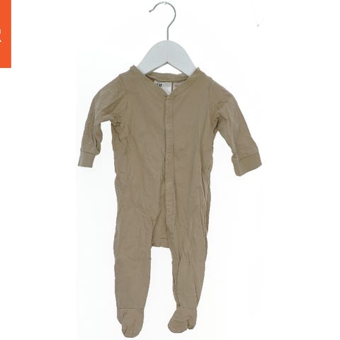Denne baby heldragt er beige og har et sødt bamseansigt trykt på forsiden med påsyet ører over skulderen. Dragten har lange ærmer og fødder samt knapper langs benene for nem lugtning. Perfekt for komfort og varme til små babyer.