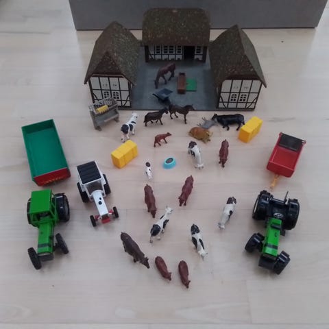 Krea Legetøjs bondegård med grøn bundplade, røde bygninger og små dyrefigurer. Sættet indeholder flere stalde/bygninger samt forskellige bondegårdsdyr, som kan placeres rundt på gården. Velegnet til leg, hvor man kan opstille en lille gård med dyr i fold og stald. Materiale fremstår som plast.