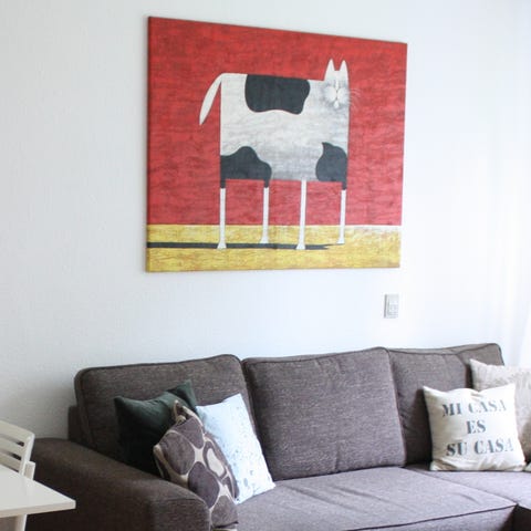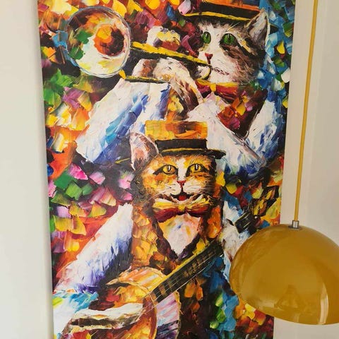 Maleri (olie på lærred) af Niels Grønbech fra 1953 med motiv af en ung pige ved et vindue, der holder en kat. I forgrunden ses en gul stol og et bord med blå ben. Farverne er overvejende blå, grønne og jordfarver, udført i en løs, malerisk stil. Billedet er indrammet i en enkel, gylden ramme og egner sig til ophængning i stue, gang eller kontor. Motivet har et interiørpræg med fokus på lysindfald og skygger i rummet.