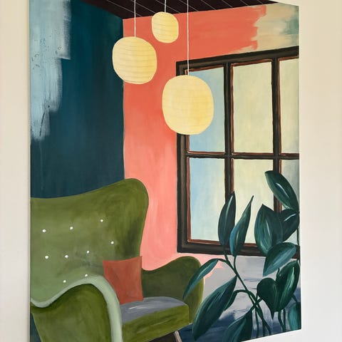 Maleri af Niels Grønbech “Interiør med 2 vinduer”