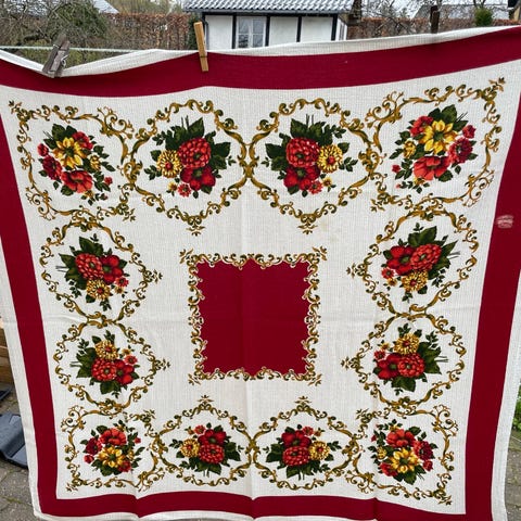 Dug i rød farve. Tekstilet fremstår som et ensfarvet rødt stykke med diskret mønster