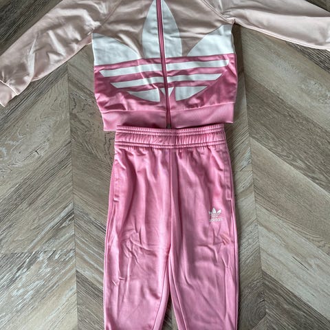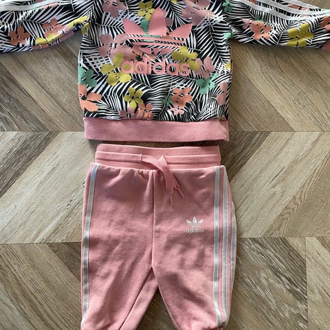Fint Adidas sweatsuit str. 92 eller 18-24 måneder i flotte lyserøde nuancer. Er koi god stand, men en lille blå tus pris foran (se billede).