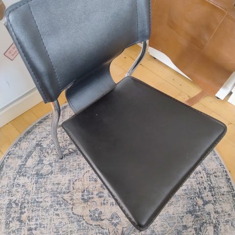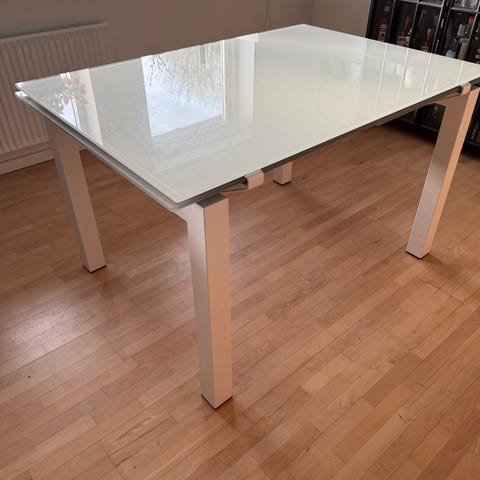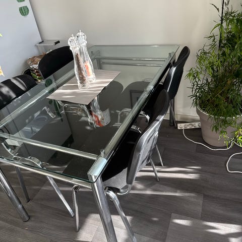 Har et spisebord i glas på 170 cm i længden, man kan trække enderne ud så bordet bliver 2 meter. Der medfølger 6 spisebordsstole de fungerer men er lidt slidt, birdetfejler intet.