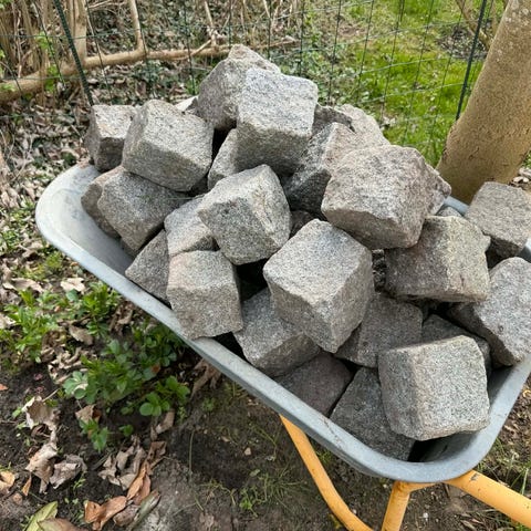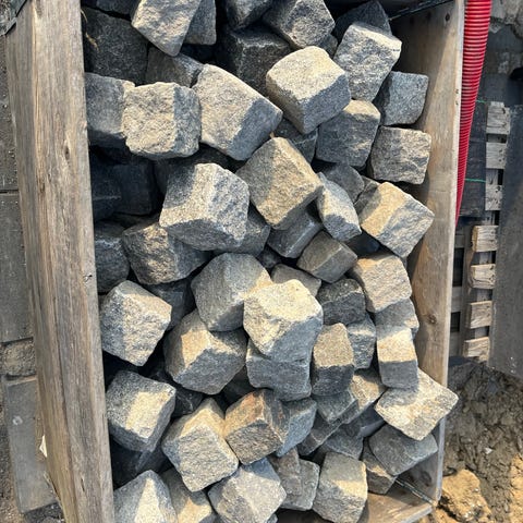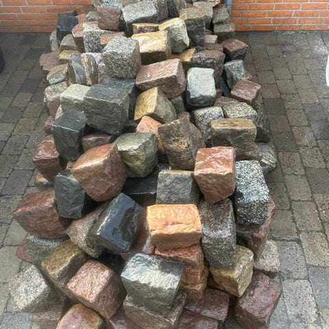 Brosten i granit, egnet som belægningssten til fx indkørsel, sti eller terrasse. Stenene er grålige i farven med naturlig variation og patina. Formen er overvejende kubisk, velegnet til lægning i forskellige mønstre. Kan anvendes til både private og offentlige udendørsarealer, hvor der ønskes en robust og klassisk belægning.