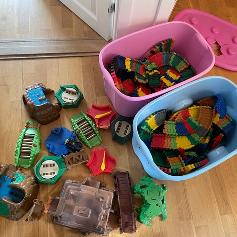 En masse blandet Flexitrack. En kæmpe Ikeapose med skinner, mange biler og en masse andet tilbehør. Der kan godt være noget af det, der ikke virker mere. Det har ikke været i brug hos os meget længe.