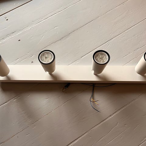 Super flot stilren sort metal. Spots og skinne går næsten i ét med hinanden. Alle 3 spots kan drejes og vinkles så lyset falder, som man vil have det. Den er købt i en lampe-butik på lyngby hovedgade til 3000,-